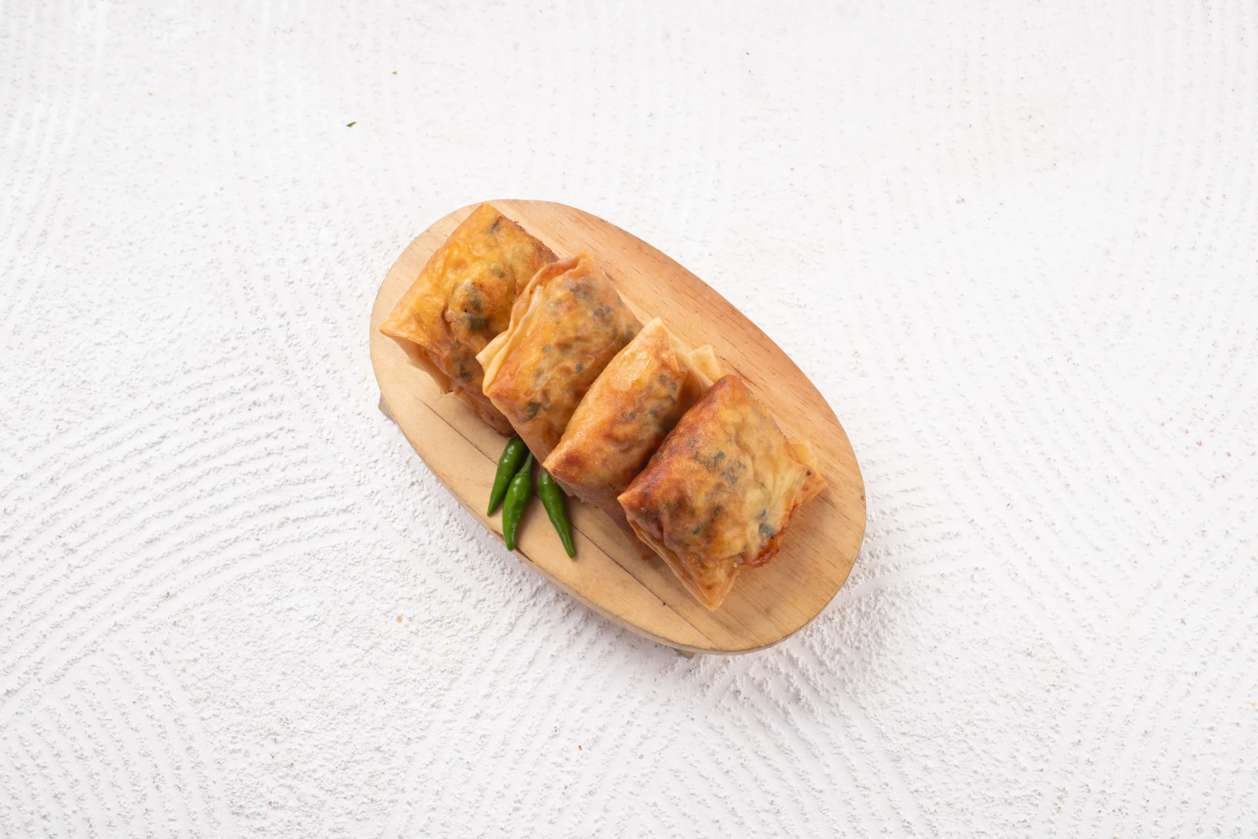 Martabak isi telur, sayur dan ayam cincang dibalut dengan kulit lumpia yang crispy, cocok jadi camilan sore hari.
